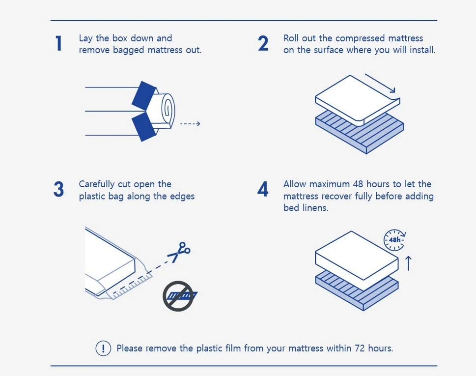 - Set Up: Simply take your mattress out of the box and enjoy watching it decompress. Jumping, walking, and sleeping on your mattress can speed up the process.