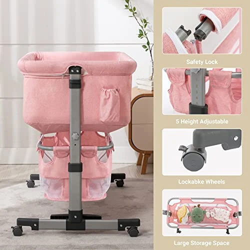 - 【Height Adjustable】Cuddor bassinet for baby has 5-level adjustable height, you can easily adjust through the leg button to suit the adult bed height. The open side of the bassinet is designed with safety lock that only adults can operate.