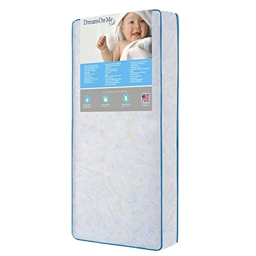Dream On Me Twinkle star 117-coil crib and toddler Mattress features a heavy-duty innerspring with a firm infant side featuring CertiPUR-US certified layers for comfort. Flex edge provide extra side edge support and safety when baby starts to pull up to a standing position or when the mattress is used with a toddler bed. The outer cover is made of an easy-to-clean material that helps you Make sure your baby’s sleeping environment stays sanitary. It features 117 heavy-duty 15 gauge Steels coils for maximum durability and support, and nine-gauge border rod for extra side strength. A heavy-duty tear and water-resistant vinyl covering protects the mattress for years of use, while vinyl edge-binding tape keeps edge seams from splitting.