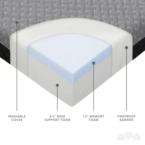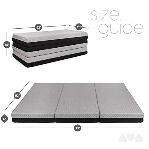 - Size- Mattress measures 52 inches wide x 75 inches long x 6 inches thick. When in folded position, mattress measures 25 inches x 52 inches x 18 inches. Perfectly sized fitted sheet sold separately.