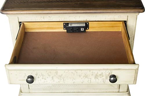 - Two 110 outlets and two USB ports easily accessible behind nightstand | Hand rubbed 8 step finishing process highlights the beautiful grain pattern of solid Acacia and New Zealand pine wood | Sealed with safe, water based lacquer for a velvety finish protected from scratches and stains | Strong furniture back panels are flush, recessed, fitted and screwed