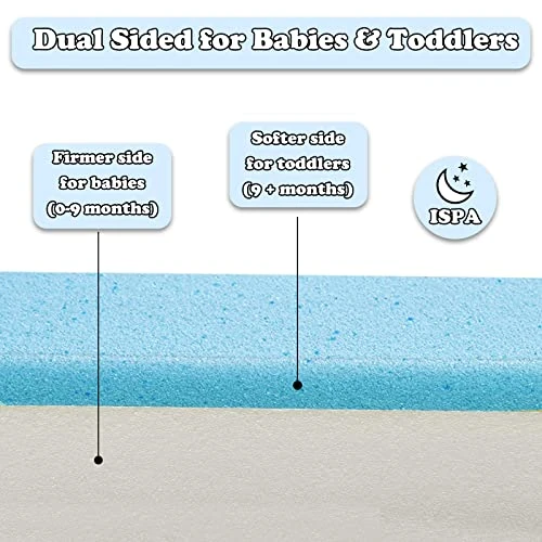 - 【DUAL SIDED FOR BABIES & TODDLERS】:Our pack and play mattress uses FIRM and SOFT two-sided design, evenly dispersed stress points, comfortable support for baby’s body. High-Density Support Foam white side for babies (0-9 months) can better support protect the baby’s spine. The blue side of the highly elastic memory foam creates a soft and comfortable play surface for toddlers (9 + months).