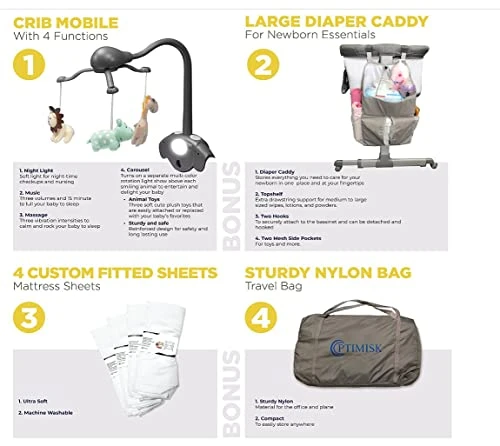 - WHAT IS INCLUDED: The bassinet includes 1 mattress, 1 mattress Board, and 1 travel bag. We’ve been there, and we’re here for you so we’ve also added 3 BONUS items including 4 fitted mattress sheets to help with laundry, a detachable 4in1 Crib Mobile to entertain your baby, and a large detachable hanging all-purpose diaper caddy for organizing baby changing essentials.
