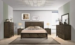 - Rustic, Country style. Natural wood grain. Ample storage space with drawers and shelves. Featuring beautiful wood planks details on sleigh headboard