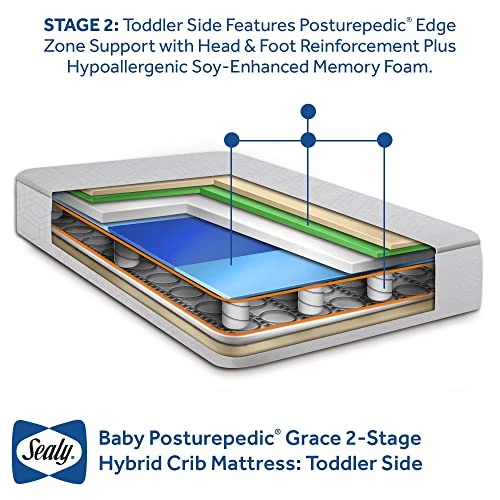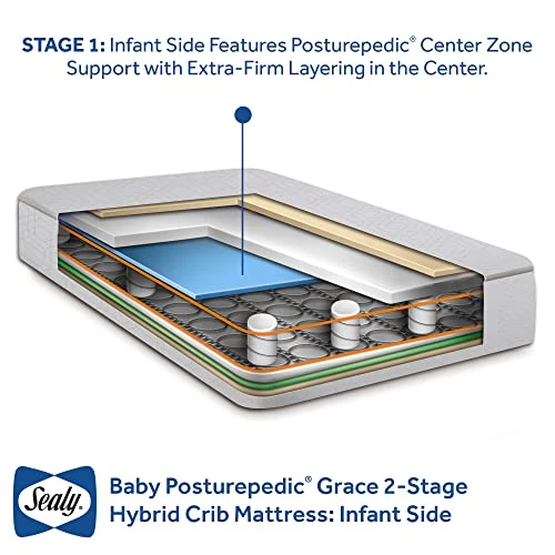 Sealy Baby Posturepedic infant and toddler crib mattresses provide one-of-a-kind targeted support with the Posturepedic advanced zone support system. The targeted areas create support and comfort where infants and toddlers need it most. Center zones target the Sweet spot, where infants are placed in their cribs, offering enhanced firmness in the middle of the mattress. Comfy layers are added to the toddler side plus extra head and foot support for active toddlers. The Sealy Baby Posturepedic grace Hybrid model is upgraded as a coil and foam “Hybrid” Similar to adult mattresses. This offers extra comfort and pressure-relieving feature like the soy-enhanced memory foam cushioning that safely senses and responds to your child’s movement for contouring comfort. American-made coils and foam are tested for lasting durability. Measures 51.63 x 27.25 x 5.75.
