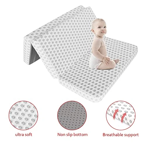 - PORTABLE MATTRESS IN A BOX: This pack and play mattress ships compressed in a lightweight box for ultimate convenience. With vacuum compressed, open the outer plastic film, unroll the pack n play mattress. For optimal performance, we recommended to leave it for 72 hours to expand. There are removable waterproof cover with anti-slip bottom, tri-fold mattress, 1 storage bag inside the box.
